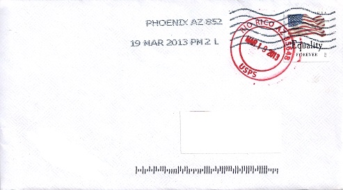 | Hand cancellation: "RIO RICO, AZ 85648 USPS MAR 19 2013". |