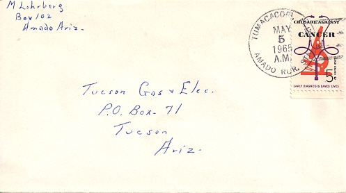 | Hand cancellation: "AMADO RUR. STA., TUMACACORI, ARIZ. MAY 5 1965". |