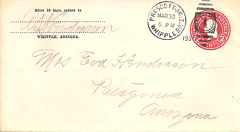 | Hand cancellation: "WHIPPLE BR., PRESCOTT, ARIZ. MAR 30 1931 ( 1 )". |