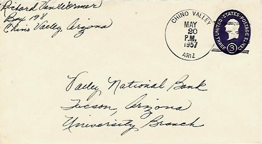 | Hand cancellation: "CHINO VALLEY, ARIZ. MAY 20 1957". |