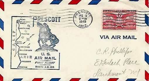 | This cacheted cover is for the first air mail flight from Prescott to Phoenix. Machine cancellation: "PRESCOTT, ARIZ. DEC 19 1949". |