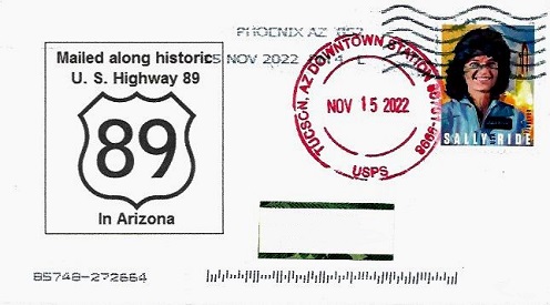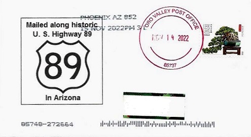 Here are postal cancellations from post offices along U. S. Highway 89. Route 89 has received several names including the "National Park Highway", "#1 Drivers' Drive in the World", and "America's Most Scenic Road". It passes through, next to, or is the major access to seven national parks, eleven national monuments, national historic sites and national recreation areas, nine national historic or scenic trails, two national heritage areas, and fourteen national forests. Highway 89 was one of the original U. S. highways established in 1926. Historically it stretched from the U. S.-Mexico border at Nogales, Arizona, north through Utah, Idaho, and Wyoming to the U. S.-Canada border north of Babb, Montana. In 1992 the section of Highway 89 in Arizona between Nogales and Flagstaff was decommissioned. That original alignment is now called Historic U. S. Highway 89. However, the portion of original U. S. Highway 89 from just north of Wickenburg north through Prescott to Ash Fork is now signed Arizona State Highway 89.