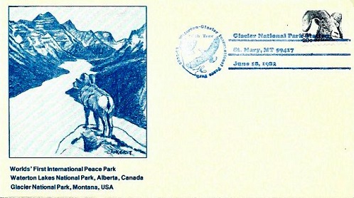 | Special hand pictorial & slogan cancellation: "Glacier National Park Station, St. Mary, MT 59417 June 18, 1982 | Waterton-Glacier International Peace Park 1932-82 |". |