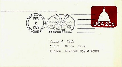| Special hand pictorial & slogan cancellation: "CENTENNIAL STATION, BELT, MONTANA 59412 FEB 2 1985 | 1885 - 1985 THE ONLY BELT IN THE U.S.A. |". |