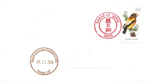 Hand postal cancellation: "KANAB, UT 84741 USPS JUL 31 2014". Passport cancellation: "Grand Staircase-Escalante NM. Kanab, UT. JUL 31 2014".