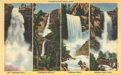 | "Vernal Falls, Yosemite". Hand colored real photo postcard. Published by Martin - Ross Co., Pasadena, Calif. Number 279. Unused. Probably circa early 1930s. |