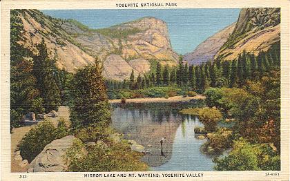 | "Half Dome, Yosemite Valley". Hand-colored printed postcard. Published by Sunny Scenes, Inc., Winter Park, Fla. Number 2000-162. Postmarked 1935. |